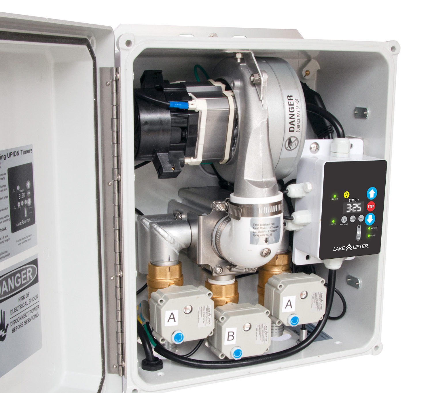 SAFER, FASTER, STRONGER: Lake Lifter’s NEW AC Boat Lift Blower Motor Control Box: (One Lift - Three Valves) is an all-in-one blower motor control box that provides everything needed to quickly operate any air-displacement boat lift with safe and reliable AC power. This powerful unit works on all brands & styles of air-displacement boat lifts. Simply mount the control box to any vertical post to save precious dock space and connect your hose, and you’re ready to go! Not sure about options? Give us a call and we’ll be happy to design & recommend the control box for your specific boat lift.