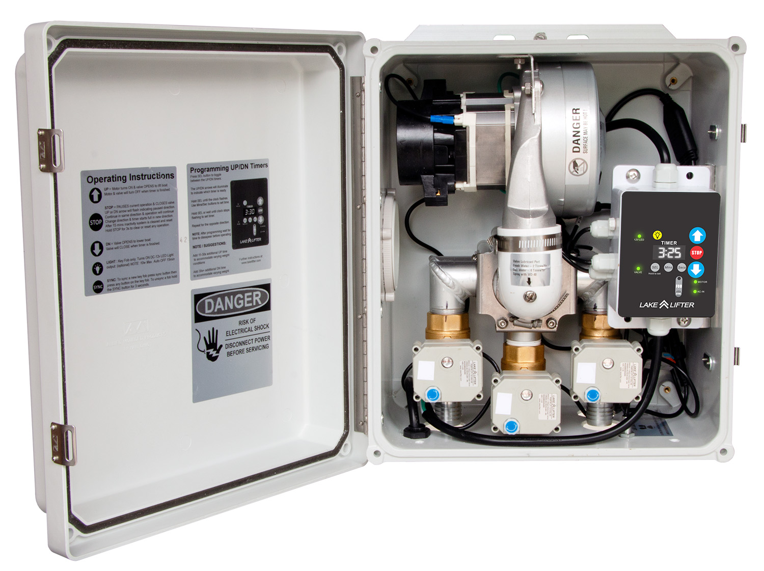 Our advanced AC Boat Lift Blower Motor Control Box: (One Lift - Three Valves) is a compact, easy to use design. Wireless & programmable functionality takes all the guess work out of lifting and raising your boat! Simply program the lifting and lowering times for fully automatic manual or wireless operation!