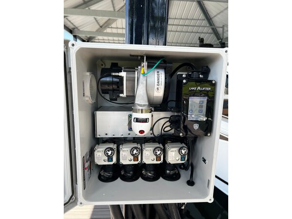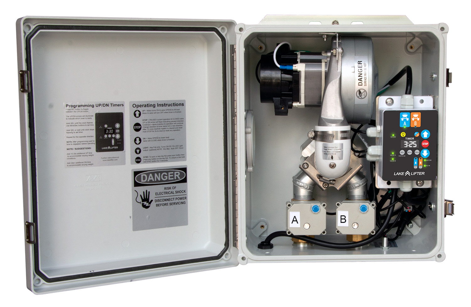 This "His & Hers" Control Box controls TWO seperate boat lifts with TWO valves (one to each lift). This configuration saves costs and dock space for 2-lift setups.
