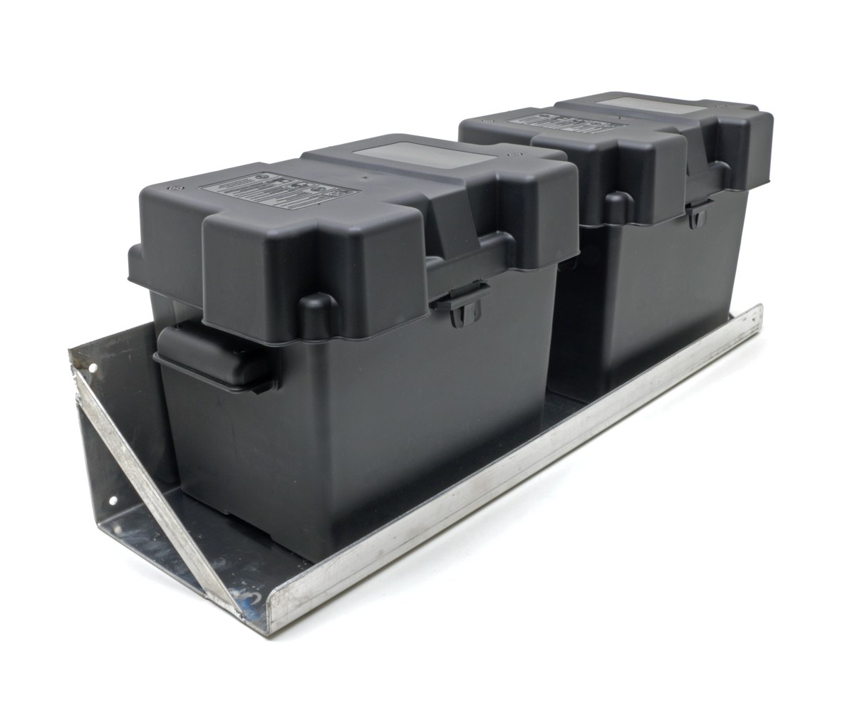The Wall Mount Dual Boat Lift Battery Tray is used to support two 12v batteries used for 24v boat lift motor systems to the wall or vertical surface  of a boat house This sturdy unit is designed to mount to square or rectangular horizontal canopy beams only.  Especially designed to keep the batteries stored up high and out of the way, the Wall Mount Dual Boat Lift Battery Tray keeps your boat lift system tidy.  Our high-strength aluminum construction prevents breakage, corrosion, and sun-damage. For boat lifts under a canopy, please check out our selection of Boat Lift Battery Trays/Boxes.